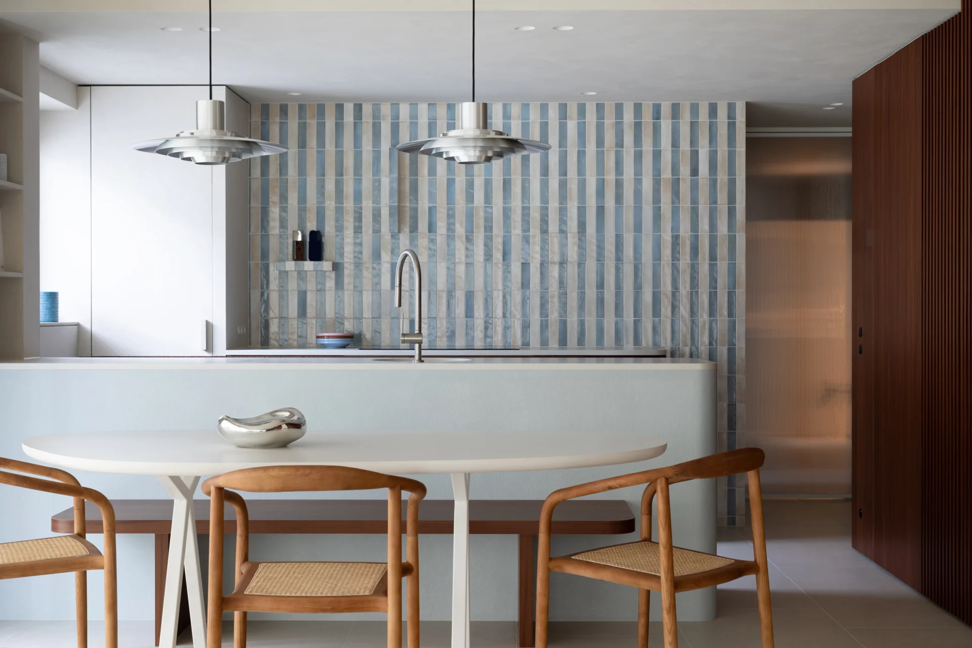 For this kitchen project in Sint-Idesbald, design studio Doorvorm chose a fresh mix of blue and white, complemented by dark wood that adds a touch of luxury. The round sink brings a playful accent to the clean design. A stylish and welcoming place to come home to after a day at the beach.